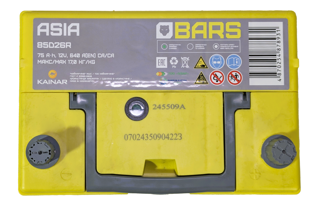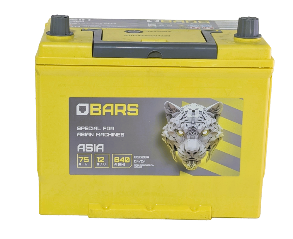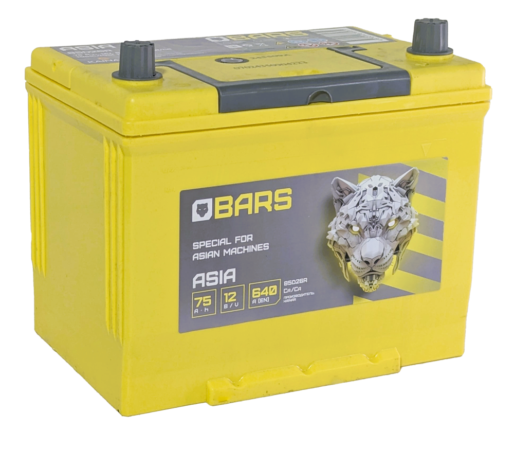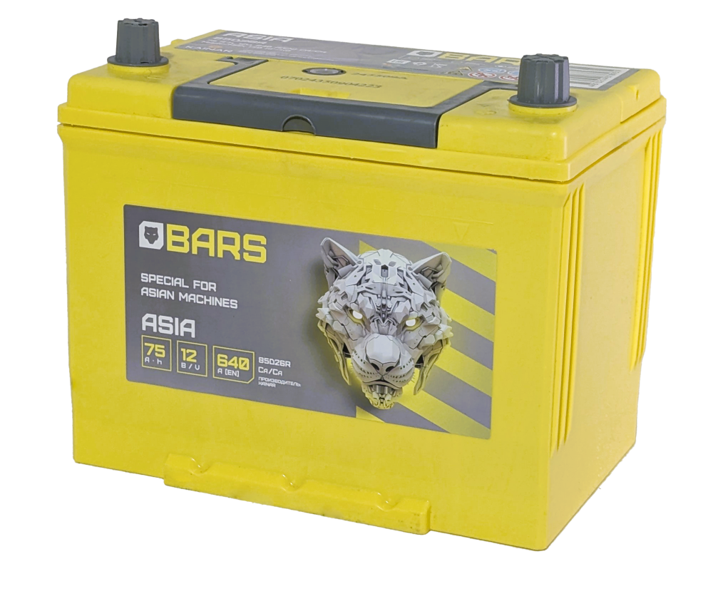 Аккумулятор BARS Asia 75 R+ — это мощная и выносливая батарея, произведенная в Казахстане и специально разработанная для автомобилей азиатского рынка. Корпус стандарта JIS D26, повышенная емкость 75 Ач и толстые клеммы делают его идеальным решением для японских и корейских внедорожников, кроссоверов и седанов с объемом двигателя 2.0 литра и выше.